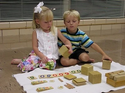 The math area contains an array of materials that begin with basic numeration to comples mathematical operations such as addition, subtraction, multiplication, division, fractions, etc. Mathematics are presented sequentially and approached on a sensorial level. For example, once a child learns the concept of zero through nine, they are introduced to place values using the "golden bead materials". They can then progress to creating numbers, combining numbers (addition), repetitive addition (multiplication) , subtraction, and repetitive subtraction (division).
